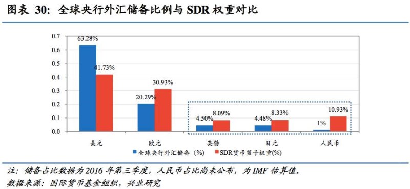兴业研究今年1月的《人民币国际化半年报》中就曾分析到,全球央行对于人民币的储备需求将逐渐增加 。全球SDR总量为1826亿,折成美元仅约3000亿美元。以人民币所占SDR份额10.92%的比例进行折算,人民币由SDR作为收支结算而引起的增配效果大约为2000亿人民币左右。